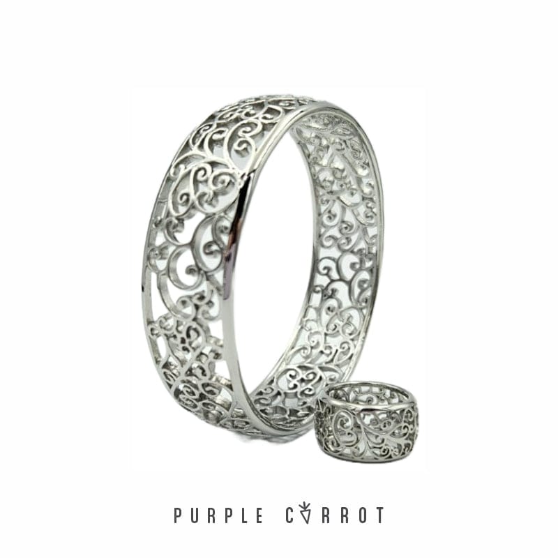 PRODUCT DESCRIPTION Intricately woven with gorgeous detail, this Filigree ring and bangle are on the wider...