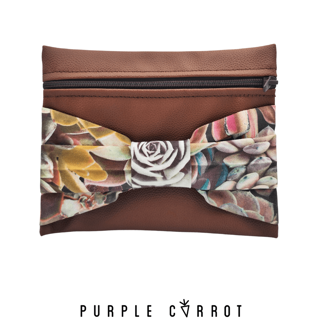 Introducing a stylish vegan leather bow tie bag in a rich brown color, beautifully adorned with a charming dessert rose print bow made from soft cotton. This eye-catching accessory combines eco-friendly materials with a feminine touch, making it a perfect choice for those who appreciate both fashion and sustainability. The delightful bow not only enhances the bag's unique design but also offers the option for personalized engraving, allowing you to add your initials or a special message for a customized flair. With its spacious interior and lovely details, this vegan leather bag is both practical and trendy, making it an essential addition to your collection. |