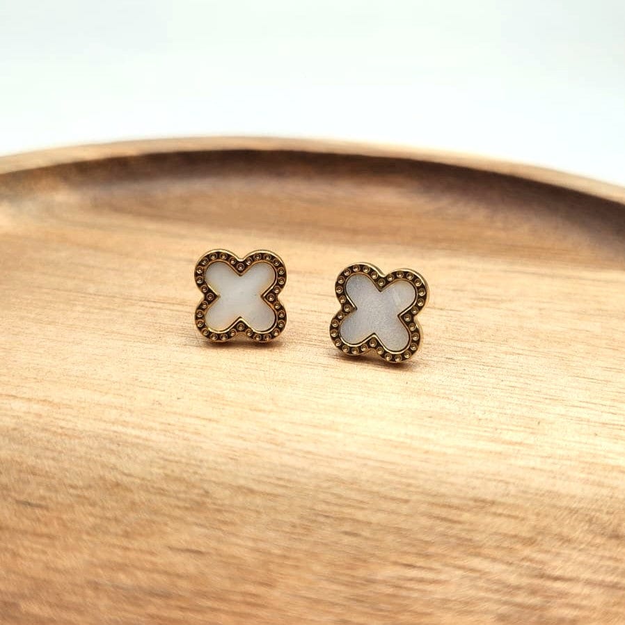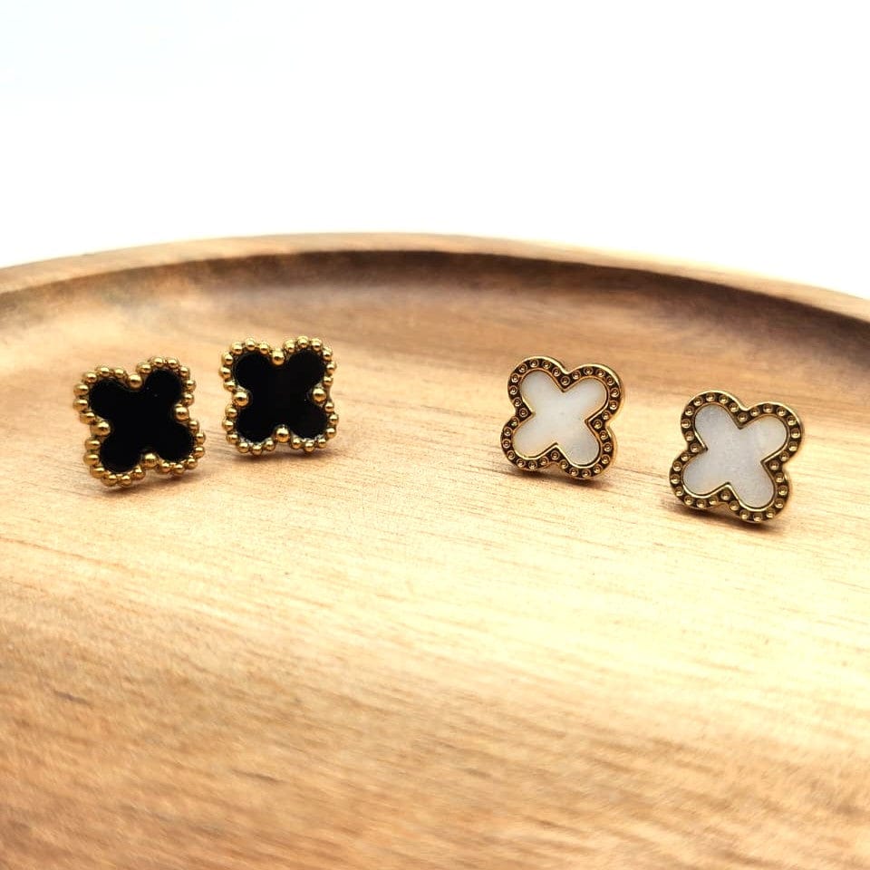 Discover the understated glamour of our Clover Blooms Earrings. The delicate 18k gold plated setting beautifully frames the polished black or opalescent white clover design, catching the light with every movement. These refined studs offer a subtle sparkle and a touch of iconic design, perfect for adding a hint of luxury to your daily wear. |