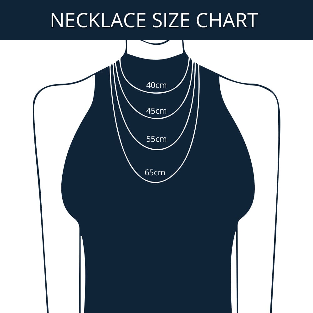 Very Important: Please note that necklace lengths will vary on how they hang depending on the size of your neck. To ensure the best fit, we recommend measuring your neck with a chain to determine the most suitable length. The size depicted in the image corresponds to ladies wearing sizes 34 to 40